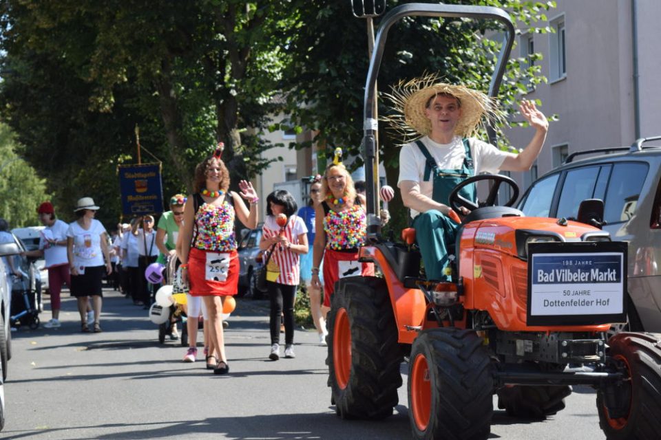Langsam setzt sich der Zug in Bewegung, vorne angeführt von einem Bauern mit grüner Latzhose auf einem alten Traktor. „Hallo, viel Spaß auf dem Vilbeler Markt und schöne Markttage“, ruft er guter Dinge in die Menge am Straßenrand. „Moment mal, das ist ja der Bürgermeister!“, ruft ein alter Herr, der die Stimme erkannt hat, und winkt aus seinem Fenster in der Ritterstraße amüsiert zurück, wo er es sich mit einem Kissen bequem gemacht hat.