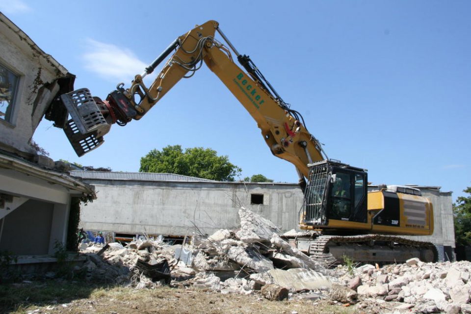 Bad Vilbel. Baggerführer Arnd Willems betätigt zwei Hebel in seinem Führerhaus: Damit setzt er den großen Greifer seines Abrissbaggers in Bewegung. Die beiden Krallen fahren auseinander, dann fährt er seine Maschine noch einen Meter weiter nach vorne und setzt den offenen Greifarm an die Ecke. Die beiden Hälften schnappen zu. Wieder ist eine Ecke des alten Kurmittelhauses abgebissen.