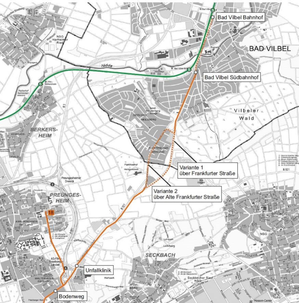 Die vorgeschlagene Straßenbahnverbindung zweige nördlich der Friedberger Warte in Frankfurt (Haltestelle Bodenweg) von der bestehenden Straßenbahnlinie 18 ab und verläuft weiter im Bereich der Friedberger Landstraße und ab der Stadtgrenze zu Bad Vilbel über die Alte Frankfurter Straße. Ab dem Heilsberg geht es auf der Frankfurter Straße bis zum Südbahnhof in Bad Vilbel. Im Rahmen der Potenzialstudie wurde auch die Weiterführung über die Kasseler und Homburger Straße bis in das Neubaugebiet »Krebsschere« untersucht, was sich laut Mitteilung als besonders vorteilhaft herausgestellt habe.
