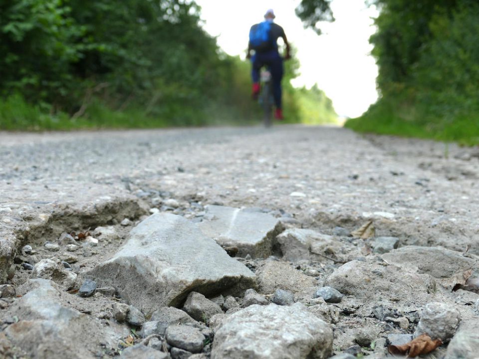 Üble Schlaglochpiste: Seit Jahren fordern Radfahrer den Ausbau des Pappelweges zwischen dem Gewerbegebiet Klein-Karben und Dortelweil. Doch die Bad Vilbeler zieren sich, wollen nicht noch mehr Autos auf dem Schleichweg. Deshalb machen sie nun einen Gegenvorschlag. Foto: den