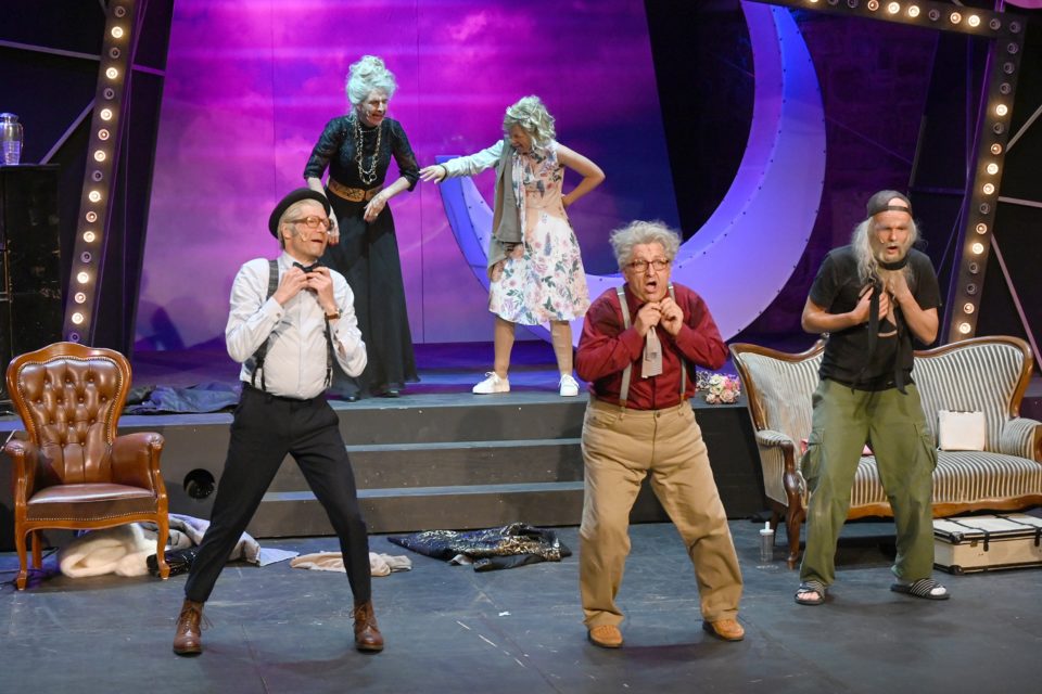 Während das Bühnenbild eher etwas karg und schmucklos daher kommt, mit einem liegenden Halbmond vor einem Sternenhimmel, einigen Sitzmöbeln und darüber der glitzernde Schriftzug »Ewig Jung« , sind Ausstattung und Maske aufwendig, fantasiereich und witzig bis in die Details. Denn die im wirklichen Leben weitaus jüngeren Darsteller verwandeln sich – auch dank der Choreografie (Kerstin Ried) – in eine exaltierte Ansammlung von Menschen mit zerknitterten Gesichtern, diversen Gebrechen und Marotten. Aber sie strahlen so viel Lebenslust aus, dass man mit ihnen lacht, mit ihnen trauert über vergangene Jugend und Liebe und mit ihnen rockt und summt und singt.