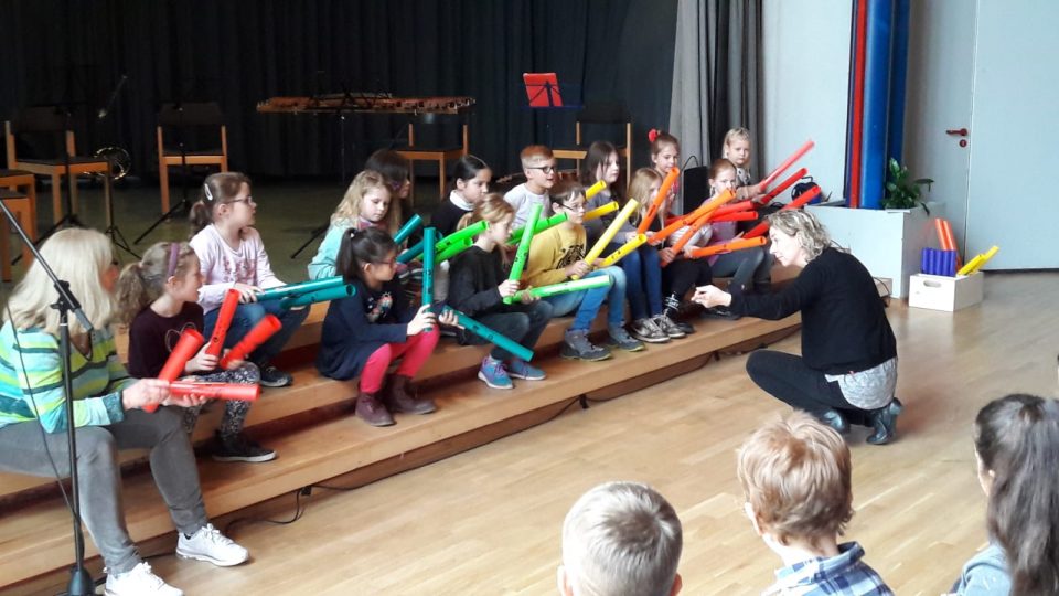 Durch das Programm, in dem auch »Star Wars« auf Boomwhackers erklang, führte Andrea Schultheiss. Weitere Beiträge kamen von den Instrumentalgruppen der 3. Klassen wie den Blechbläsern und den Streichern. Die Tastenspieler hatten ein »Saturnlied« komponiert. Das Ensemble der Klassen 3+4 schloss sich mit einer Liebeserklärung ans Weltall an, bevor der ganze Saal »Unser Raumschiff fliegt mit Sahne« sang.