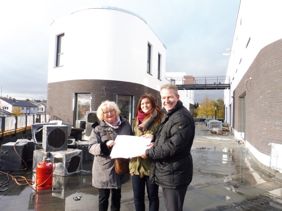 Rosemarie Plewe, Antonia Berberich und Guido Rahn (von links) mit den Plänen auf der Terrasse der neuen Bücherei im Stadtzentrum. Foto: Pegelow