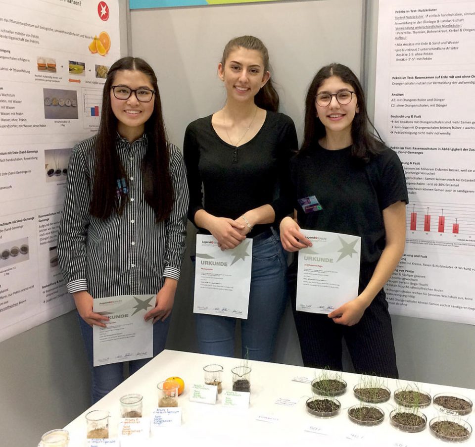 Die Fachjury würdigte in ihrer Laudatio zum Projekt der Jungforscherinnen nicht nur die Qualität der naturwissenschaftlichen Untersuchungen, sondern vor allem auch den Nachhaltigkeitsaspekt sowie den innovativen Vortragsstil von Van Anh Nguyen, Melisa Kütük und Susanne Hajjo mit der Verleihung eines Sonderpreises: Die Schülerinnen erhielten einen Koffer mit Chemikalien im Wert von 400 Euro zur Durchführung chemischer Analysen. Damit können die Mädchen jetzt weiter forschen und sich der ökologischen Landwirtschaft widmen.