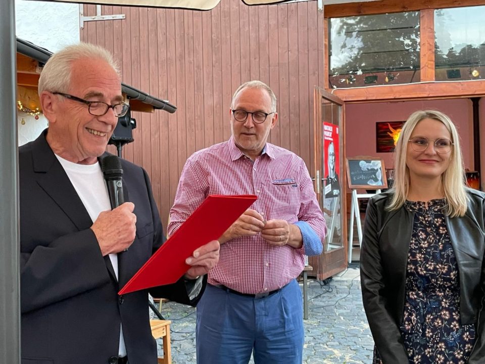 Natalie Pawlik, inzwischen direkt gewähltes Mitglied des Deutschen Bundestags, hielt die Laudatio auf den Petterweiler Hermann Reuther, in den letzten Jahren Pressesprecher der SPD Karben, und überreichte ihm die Ehrennadel und Urkunde für 60 Jahre Mitgliedschaft.