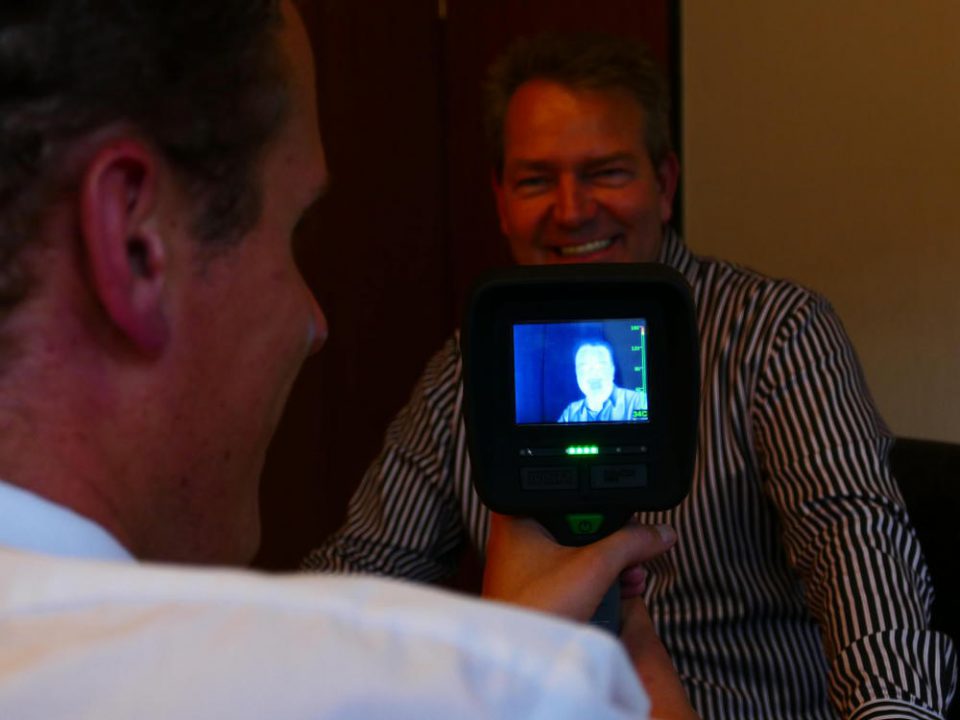 So bildet die neue Kamera Wärme ab – auch, wenn alles voller Rauch ist: Christian Becker filmt Guido Rahn. Foto: den