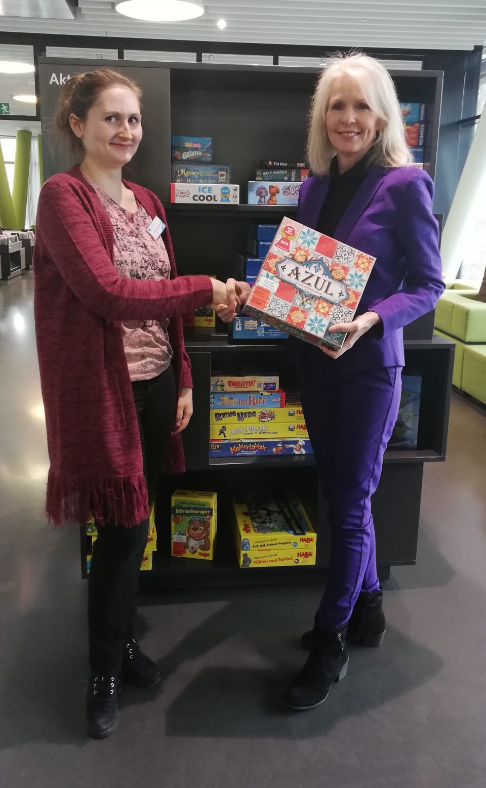 Spenderin Ruth Hormess (rechts) übergibt die Gesellschaftsspiele an eine Mitarbeiterin der Bibliothek. Foto: Privat