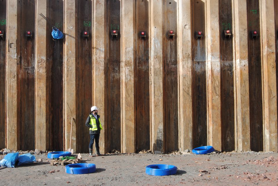 Um das zu verhindern, werden derzeit 498 sogenannte Mikropfähle ins Erdreich versenkt. Sie reichen knapp zehn Meter in die Erde und sollen durch Reibung den Auftrieb der Bodenplatte verhindern: »Die funktionieren im Grunde wie ein riesengroßer Dübel«, erklärt der Bauleiter. Noch läuft die Ausschreibung für den Rohbau. Zeitdruck verspürt Lunic daher keinen. So stiefelt er ganz entspannt von dem großen Bohrer für die Mikropfähle zu einem Bagger, der gerade eine schmale, etwa einen Meter tiefe Spur gräbt. Sofort läuft der Graben mit Wasser voll – später wird er als Kanal für das Grundwasser dienen und es unter der Stadthalle hindurchführen.
