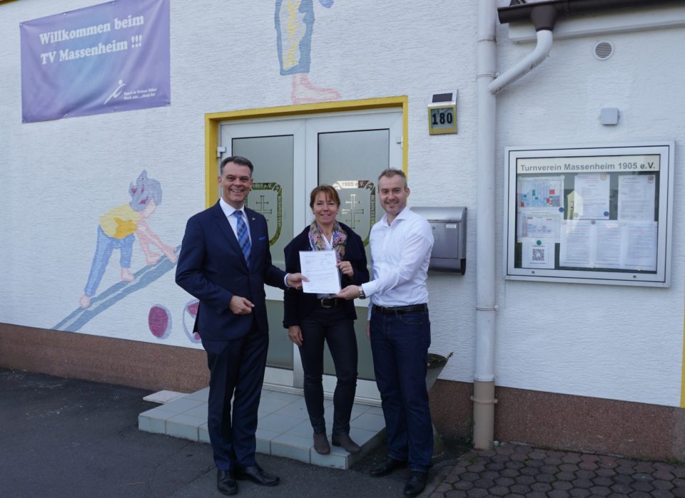 »Nachdem wir die Genehmigung für unseren Haushalt erhalten haben, konnten wir den Zuschussbescheid für den TV Massenheim nun übergeben. Damit kann der Verein die Sanierung seiner Sporthalle und Außenanlage angehen und somit die Zukunft seiner Angebote sichern. Wir freuen uns sehr, als Stadt unseren Teil hierzu beitragen zu können«, erklärte Bürgermeister Stöhr.