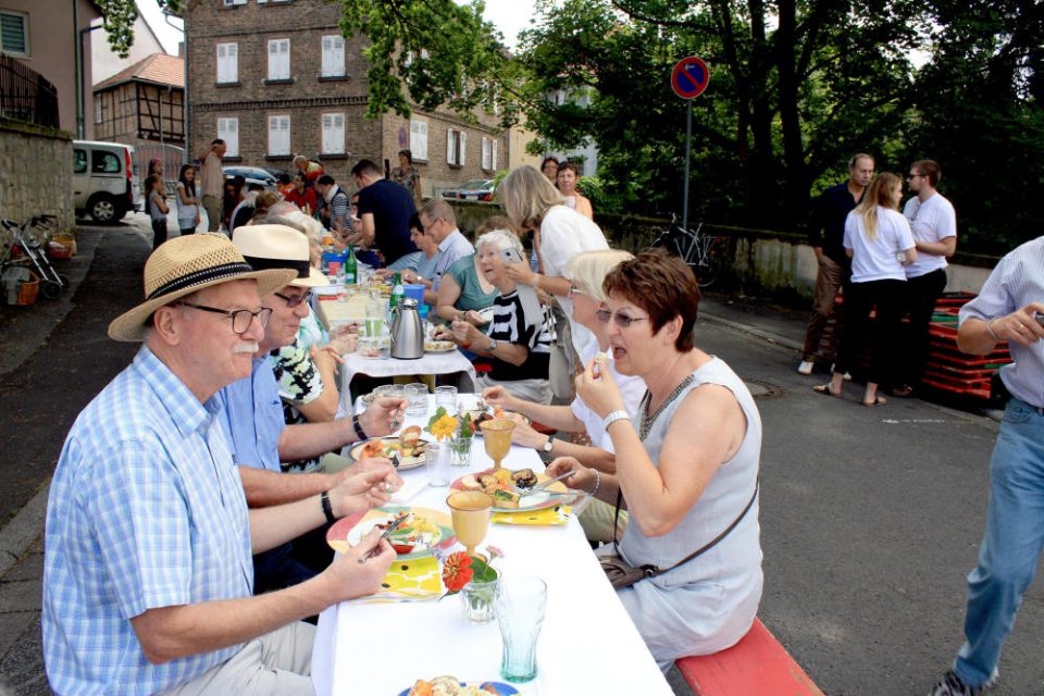 Karben. Genüsslich pickt Margrit Pfaff einen Bissen von ihrem Teller. „Mmmh, probier mal!“ Sie lächelt ihren Partner Karl Schneider an und deutet auf die Vielfalt vor ihr: selbst zusammengestellte Salate, Antipasti, frisches Baguette – allesamt serviert von Karbenern für Karbener. Denn an diesem Sonntag essen die beiden keinesfalls „gewöhnlich“ zu Mittag: Gemeinsam mit ihren Nachbarn und Freunden Erika und Ulrich Kussmaul sind sie Gäste der Luthertafel. 2500 Karbener Haushalte hat die evangelische Kirchengemeinde St. Michaelis Klein-Karben mit Flugzetteln eingeladen, mit eigenem Besteck und Geschirr und einer Gabe für das Karbener Buffet zur Tafel vor die Kirchmauer zu kommen.