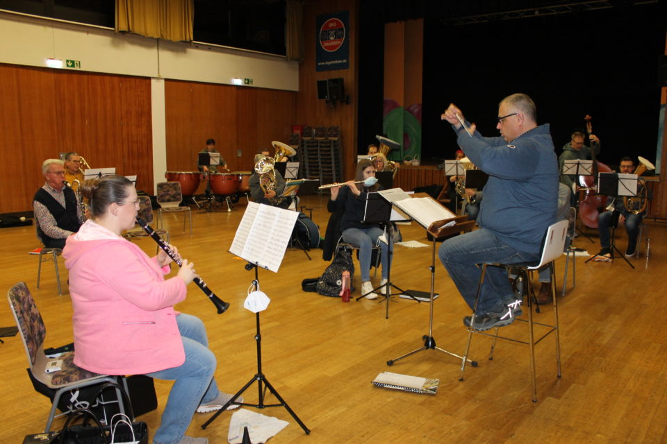 Aus dem großen Saal des Bürgerhauses Okarben dringt Musik. In einem großen Rund sitzen die Musiker, die Notenständer vor sich, an denen der Mund-Nasen-Schutz baumelt. Dirigent Claus Carsten Behrendt hebt die Taktstock, »So jetzt noch einmal, wir spielen das ganze Crescendo durch und bitte nicht so Piano, mehr Mut, wir müssen Klang machen«. Denn der Termin für das Frühlingskonzert der Stadtkapelle am 3. April im Bürgerzentrum steht fest und ist nicht mehr weit. Das Musikstück »Towards a new Horizon« hat er dafür ausgesucht, eine kraftvolles Arrangement mit voller Instrumentierung aus der Feder des amerikanischen Komponisten Steven Reineke.