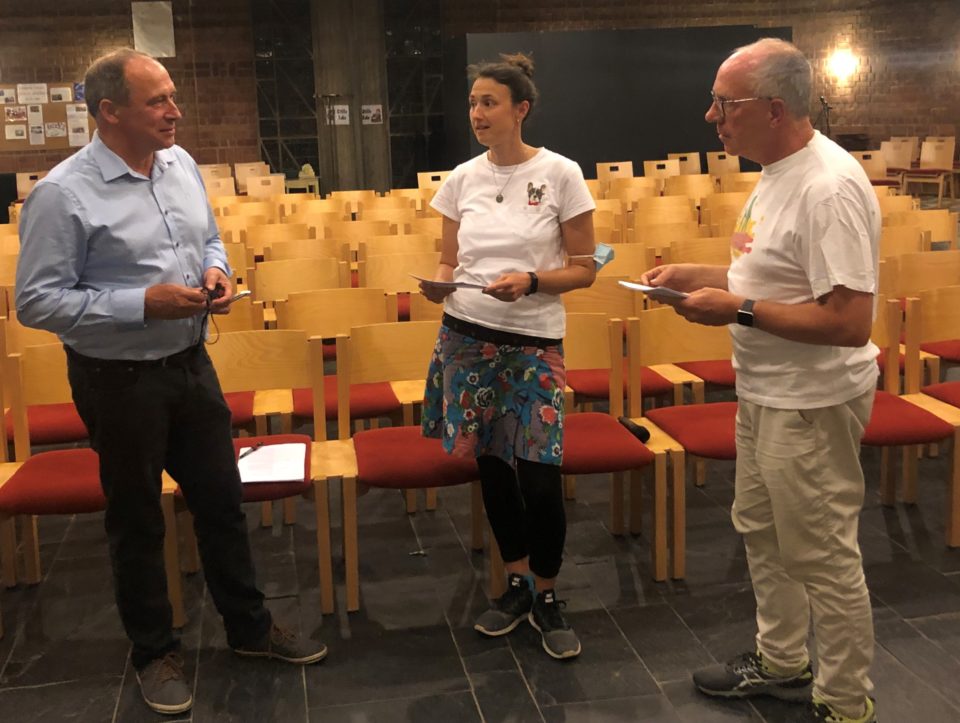 EKD-Fernsehpfarrer Stephan Fritz (li.) mit Anja Seybold und Klaus Neumeier bei einer Ablaufprobe.