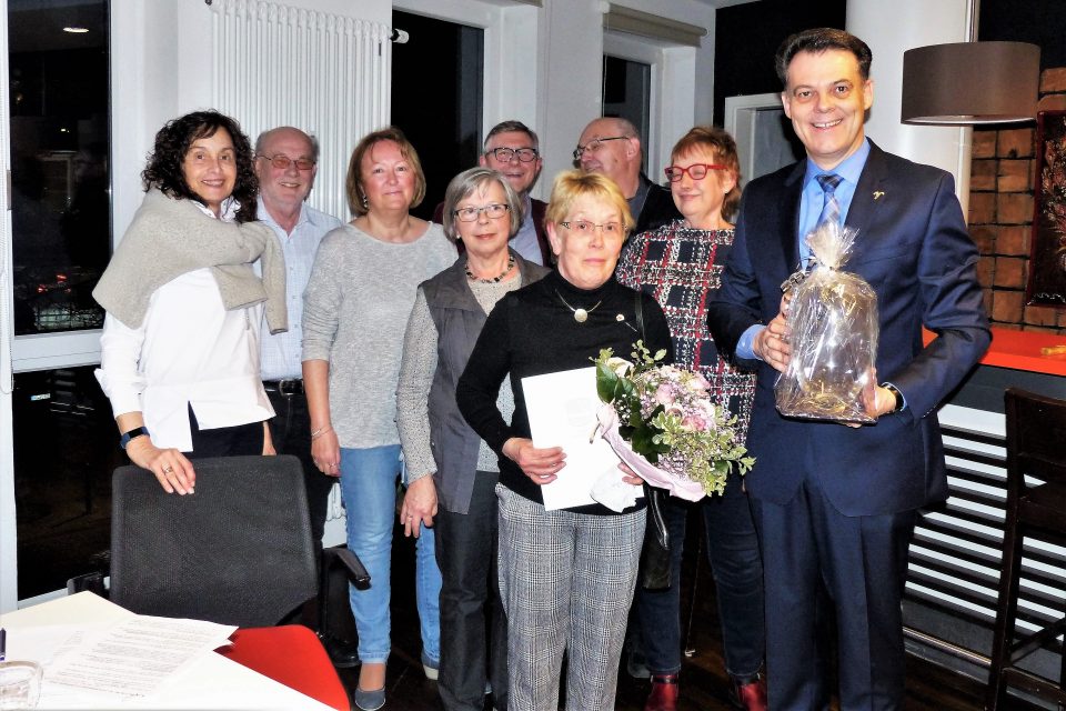 Bürgermeister Thomas Stöhr überreichte Edelgard Scholz die Ehrennadel der Stadt. Darüber freuen sich auch andere Mitglieder der Nachbarschaftshilfe. Foto: Privat