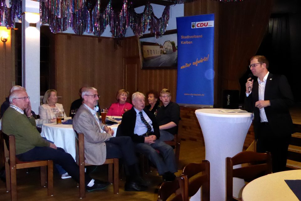Karben. Der CDU-Stadtverband hatte an Aschermittwoch zum Heringsessen geladen und freute sich über den Zuspruch von mehr als 100 Besuchern, die sich im Saalbau Schuldt in Klein-Karben einfanden. Die drei Redner der Veranstaltung gaben klare Antworten auf politischen Fragen der Zeit von Karben bis Brüssel: Landrat Jan Weckler, CDU-Vorsitzender Mario Beck und Bürgermeister Guido Rahn stellten die Wichtigkeit der anstehenden Europawahl heraus und berichteten von zahlreichen Projekten, mit denen Kreis und Stadt in die wachsende Region investierten.