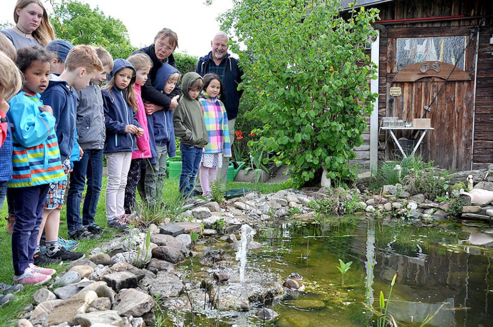 Einmal einen Frosch in echt sehen – diese Gelegenheit bot sich der Klasse 1a der Römerbad-Grundschule in Okarben. Denn Peter Bader hatte die Kinder der Froschklasse zu sich in seinen Garten mit Teich eingeladen, in dem sich jede Menge der Amphibien tummeln.