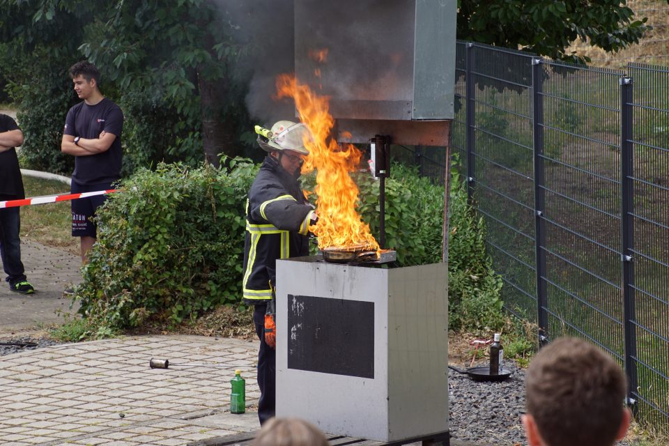 Spektakulär war die vom stellvertretenden Gerätewart Uwe Rühl und dem stellvertretenden Wehrführer Maximilian Zeifang gezeigte Demonstration einer Fettexplosion. Das Duo erhitzte Fett in einer Pfanne. Das qualmte erst leicht, dann verfärbte sich der helle Rauch schwarz und die Flammen loderten auf. »Brennendes Fett ist bereits bei der Entzündung mehrere Hundert Grad heiß. Deshalb darf auf keinen Fall Wasser ins heiße Fett gegossen werden«, warnte Rühl. Besser: Entweder einen passenden, trockenen Deckel auf den Topf legen oder ihn von der Herdplatte ziehen. (fau)