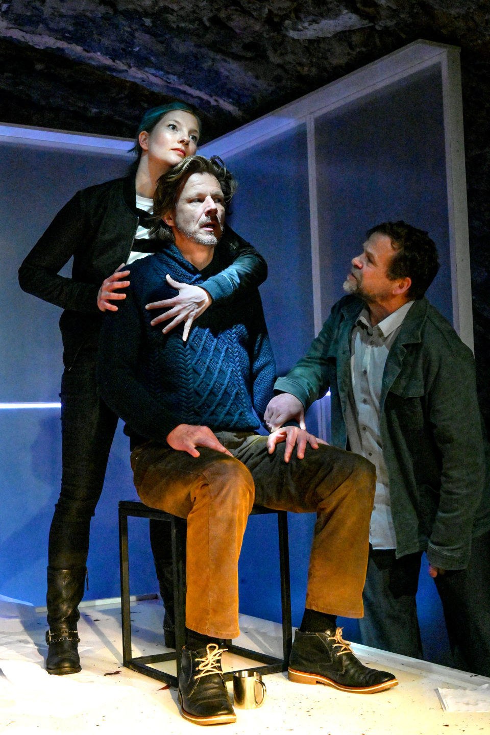 Die Bühne in der historischen Wasserburg hat trotz strahlender Ausleuchtung und halb transparenter Wände etwas Klaustrophobisches. Sie gleicht in ihrer Schlichtheit mit dem von einer dünnen Wasserschicht bedeckten Podest und einem Stahlrohrkubus als Sitzgelegenheit eher einer Gefängniszelle, einer Eremitage, einem Krankenzimmer – oder eben jener einsamen, sturmumtosten fiktiven Insel Parkum, auf welcher der einstige Star-Psychiater Dr. Viktor Larenz (Ralph Hönicke) Schutz und Abgeschiedenheit sucht, um nach vier Jahren mit dem rätselhaften Verschwinden seiner Tochter Josy abschließen zu können.