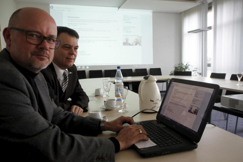 Stellen im Rathaus das neue Stellenportal der Stadtverwaltung vor (von links) Dirk Hitziger und Bürgermeister Thomas Stöhr. Foto: Thomas Kopp
