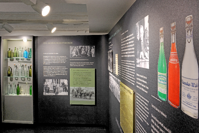 • Eine vollständig aufgebaute kleine Füllhalle öffnet ein Zeitfenster in das Jahr 1935. Zum Vergleich damit wird der Stand der Technik der Jahre 1900 und 1955 mittels Fotografien diesen Exponaten gegenüber gestellt. Und ein Film informiert über das Heute des Abfüllprozesses.