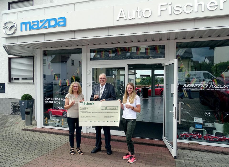 Auto Fischer feierte kürzlich sein doppeltes Jubiläum „50 Jahre Auto Fischer und 35 Jahre Mazda-Vertragshändler“ in seinem Autohaus in Okarben, Rodheimer Weg 4. Das Autohaus Fischer hat dabei für sein Projekt „Auto Fischer unterstützt Karben“ eine Tombola veranstaltet und in diesem Jahr die „Herz und Hand Nachbarschaftshilfe“ ausgewählt. Geschäftsführerin Birgit Reis und Nathalie Reis übergaben kürzlich einen Spendenscheck in Höhe von 1000 Euro an Vorsitzenden Klaus von Treichel. Er bedankte sich herzlich für diese Großzügigkeit und versprach, weiterhin mit den Helfern von „Herz und Hand“ für die Karbener Bürger da zu sein. (zlp)