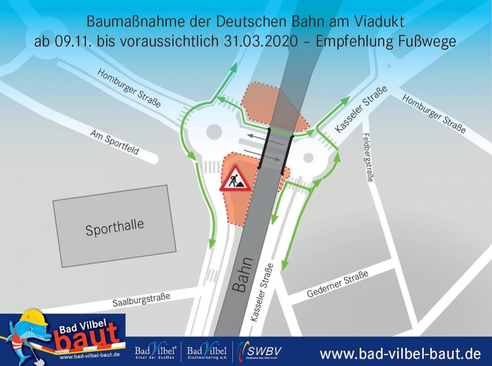 Da die Fußgängerunterführung an der südlichen Seite wegen der Arbeiten der Bahn im Viadukt nicht nutzbar sein wird, führen die Fußwege um die Kreisverkehre herum über die einzelnen Fußgängerüberwege auf der Kasseler und Homburger Straße, der Straße »Am Sportfeld« und der Max-Planck-Straße. »Mit unserer Fußwegeempfehlung gehen alle Fußgänger die sichersten Wege während der Baumaßnahme. Insbesondere da hier auch Schülerinnen und Schüler unterwegs sind, haben wir diese explizite Wegeführung empfohlen«, führt Wysocki weiter aus. (zlp)