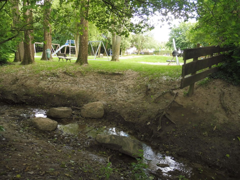 Viele Kinder sind an diesem Tag nicht zu sehen. Dabei ist ideales Spielplatzwetter, nicht zu heiß und nicht zu kalt. Aber jetzt, zu Beginn der großen Schulferien, sind eben doch etliche Mädchen und Jungen weggefahren. Als zwei Familien mit ihren kleinen Kindern den Spielplatz verlassen haben, liegt er ganz einsam an der Riedmühlstraße. Der Wind weht recht kräftig, er bläst in den alten Baumbestand. Idyllisch kann man den großen Platz schon nennen. Zumal hier noch weitgehend unberührte Natur nicht weit ist. Denn am Ende des U3-Bereichs fließt der Heitzhöfer Bach. Kinder haben drei größere Äste auf die Steine im Bach gelegt, in dem sie vorher vielleicht gespielt haben. Man kann über die Steine gehen und von der anderen Uferseite auf den Spielplatz schauen.